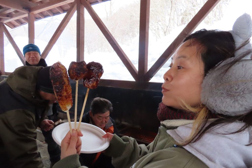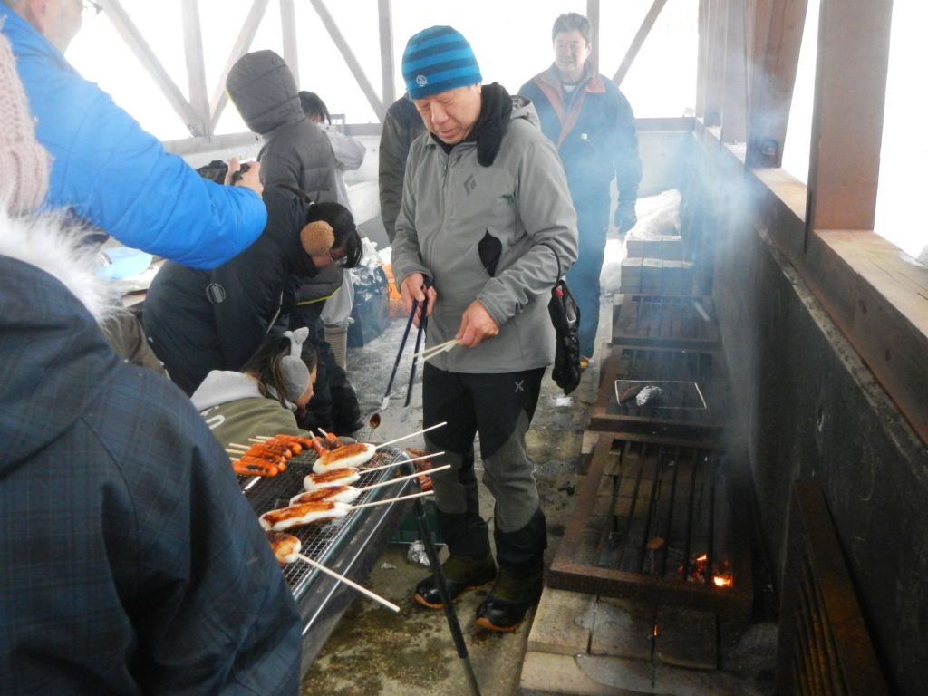 野外へ移動し、炊飯棟で炭火焼き田楽みそを塗った五平餅と味噌汁で冷えた体はポカポカ温まります