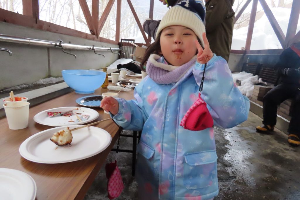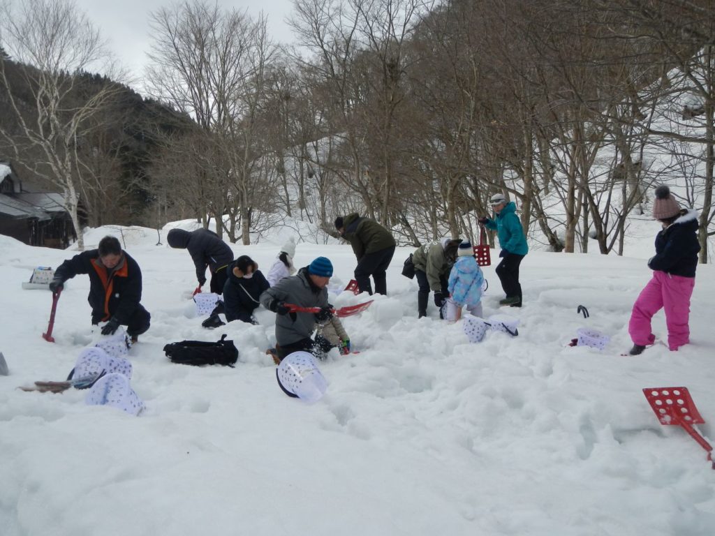 前日の天気とは打って変わり当日はどんよりとした曇り空☁️それでも8名の親子が参加し恒例のイグルー作りやソリ遊び、今年は五平餅作りにも挑戦しました。