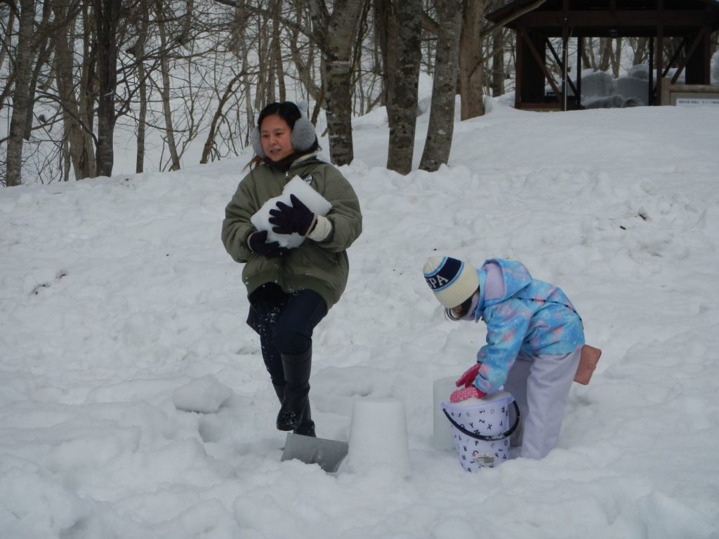 雪を作る子供とそれを運ぶ親親子でコミニュケーションをとりながら共同作業です(*^-^*)