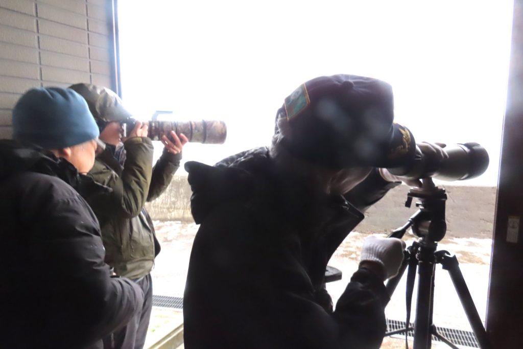 野鳥観察小屋では暖かく過ごし、曇った窓ガラスを拭きながら観察している様子が見られました