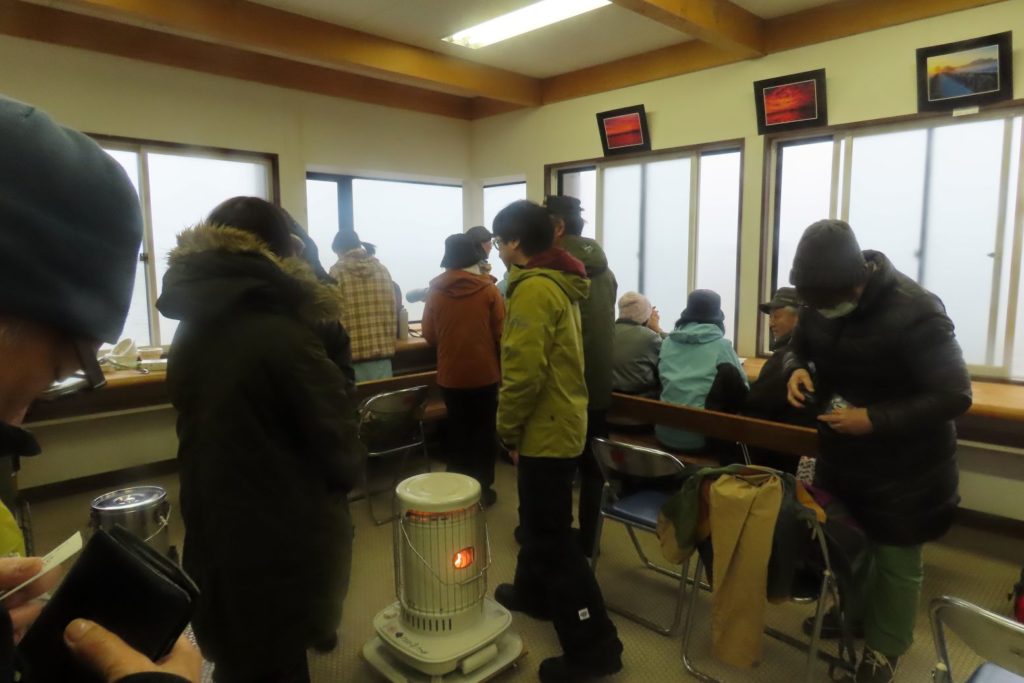 観察小屋の2階にはストーブが用意されており、思いのほか暖かく過ごせたが、窓ガラスは曇りこれまた残念な結果となってしまった。